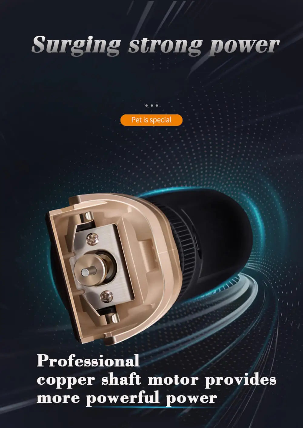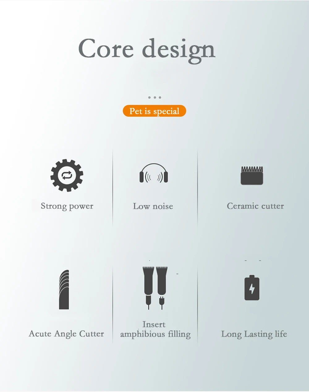 -Professional and powerful motor (the shaft is made of fine copper), easily trim pet hair without getting stuck, not hurt the skin of dogs or cats, will not rust and durable. -Precision motor, low vibration and ultra-quiet design, about 60 db, as if listening to a music box. -Low vibration and low noise motors make them more relaxed and reduce their fear of noise. -The 5-speed fine-tuning of the blade makes it easier to shave short hair for pets. -Lightweight and wireless design makes it simpler and easier to use. -Charging for five hours, can last for 60 minutes -Adjustable trimming combs are suitable for cutting hair of various lengths; removable guide combs make changing combs easy and quick, and increase versatility. -Streamlined non-slip body design according to ergonomics. -The LED light indicates the working state, and has overcharge protection to improve the safety of use. -The adjustable trimming comb is suitable for trimming hair of various lengths; the movable guide comb makes it easy and quick to change the comb, increasing its versatility.