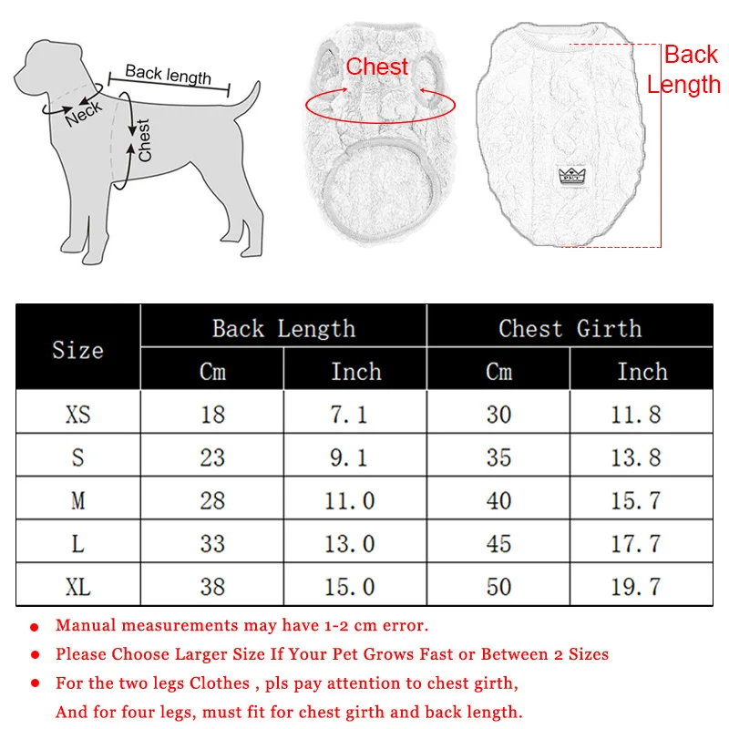 2.Please Choose Larger Size If Your Pet Grows Fast or Between 2 Sizes For the two legs Clothes,please pay attention to chest girth,And for four legs, must fit for chest girth and back length.