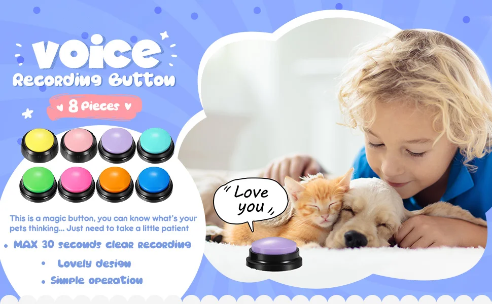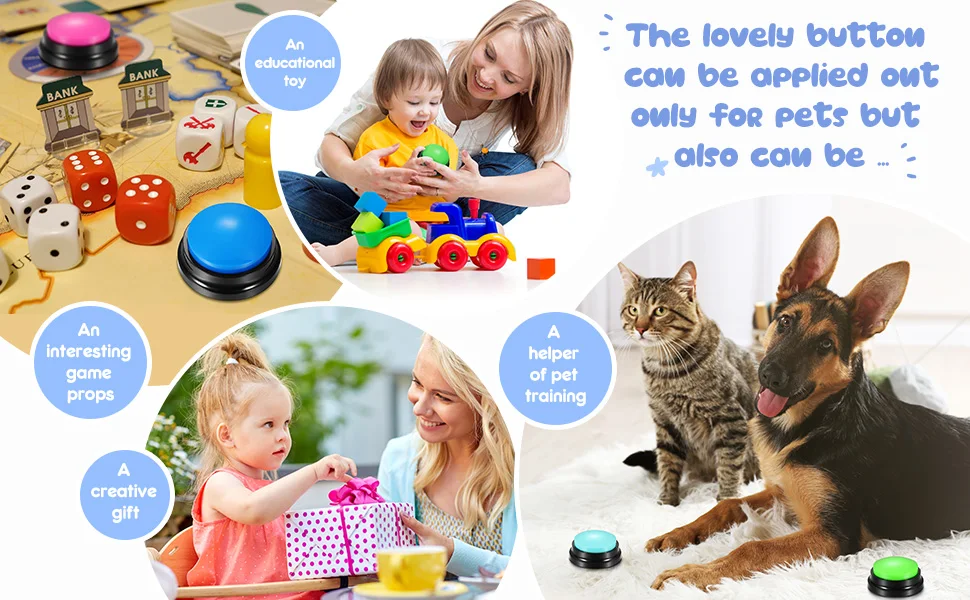 You can record commands such as "food", "drink", "outside", "yes" and "no" to let your pet communicate with you; just a little patience can make you understand the pet's mind. Very suitable for training cats, dogs and other pets, different color buttons can be used as options for different training.